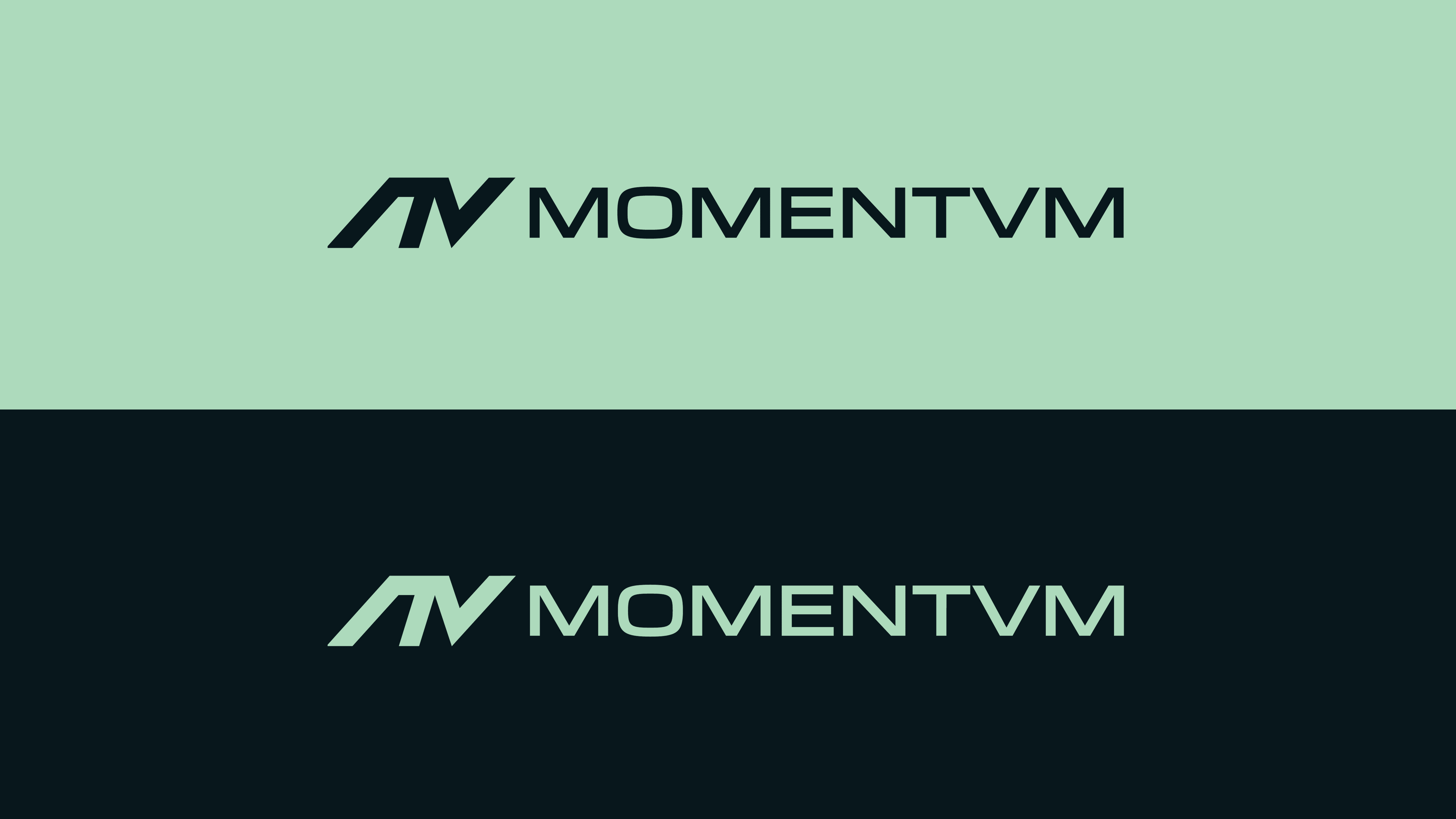 The logo includes both the "M" and "V" of MOMENTVM, while resembling the torso of a person running forward, embodying athletic pursuit and forward progress.
