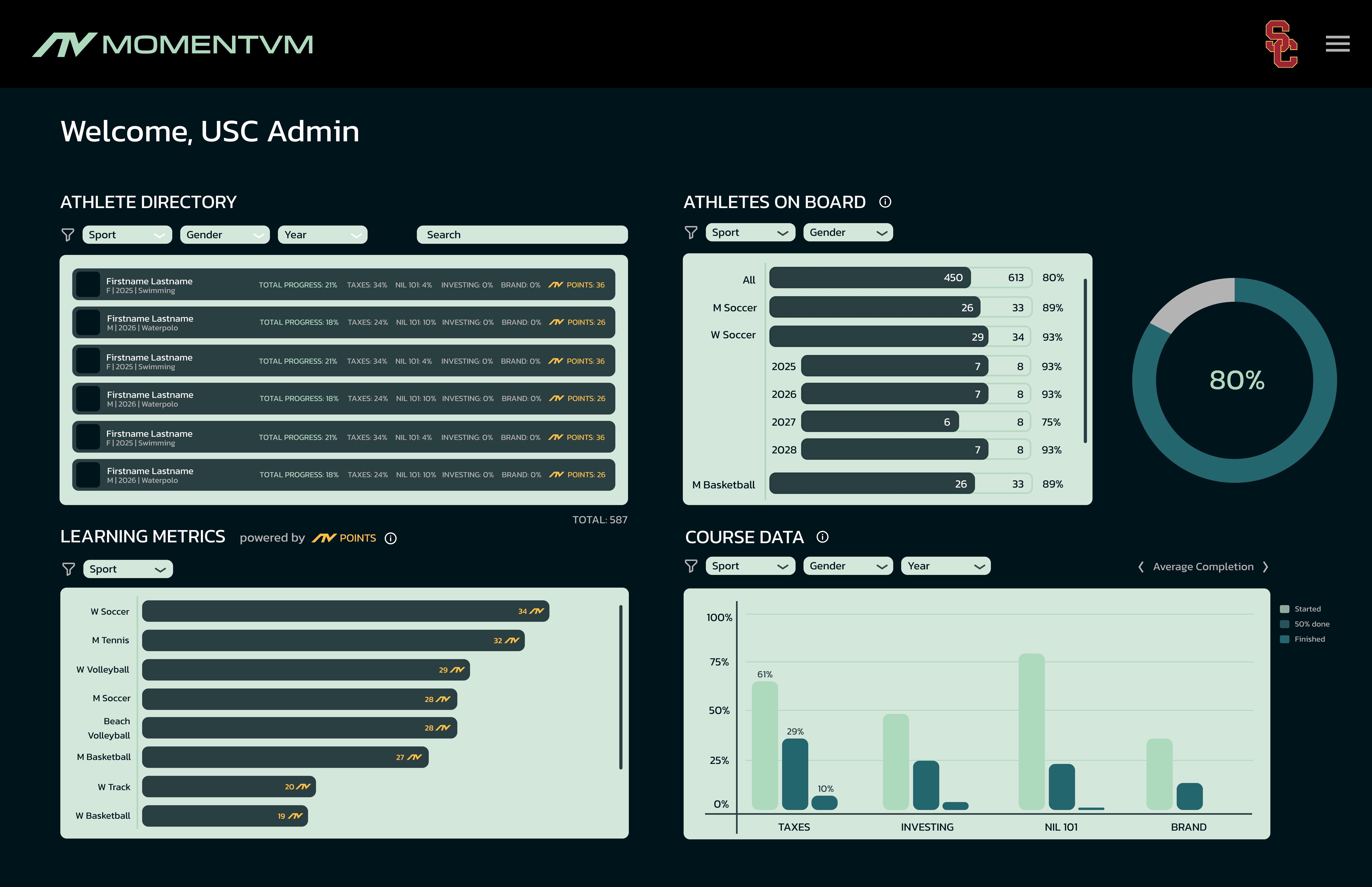 In a rapidly changing NIL (Name, Image, and Likeness) environment, our goal was to create a centralized resource for modular courses on financial literacy, taxes, and NIL regulations. The platform was designed to integrate directly with university athletic departments, allowing them to track athlete progress and manage their database more easily.