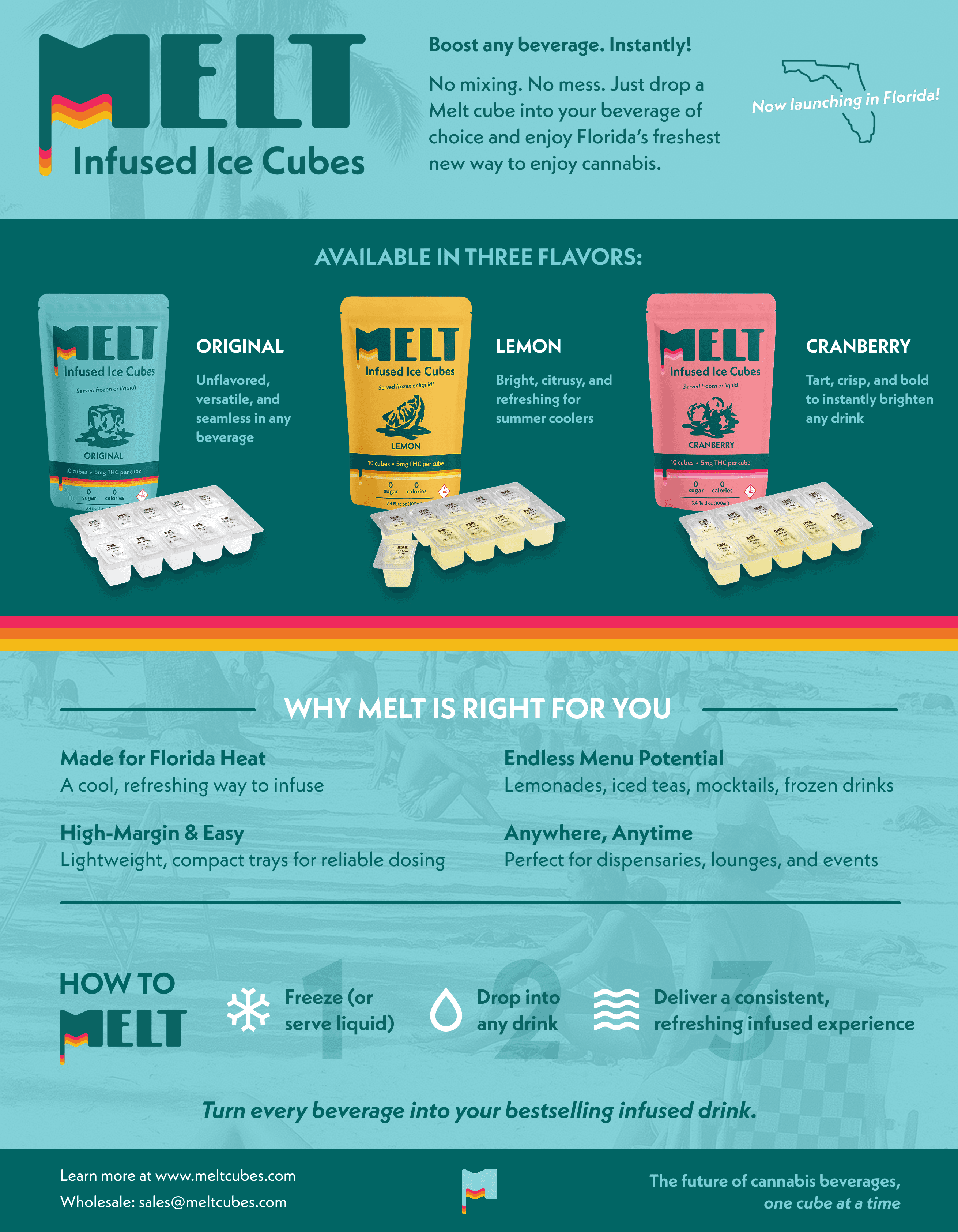 I was commissioned to rebrand and redesign the packaging for Melt, a THC-infused ice cube company founded by my uncle. With production underway and a Florida launch on the horizon, I drew inspiration from the iconic Miami Vice aesthetic, translating its bold energy into a vibrant color palette and vintage design language that captures the state's sunny climate and festive culture. I designed packaging for four flavors: Classic, Lemon, Lime, and Cranberry. See more at meltcubes.com
