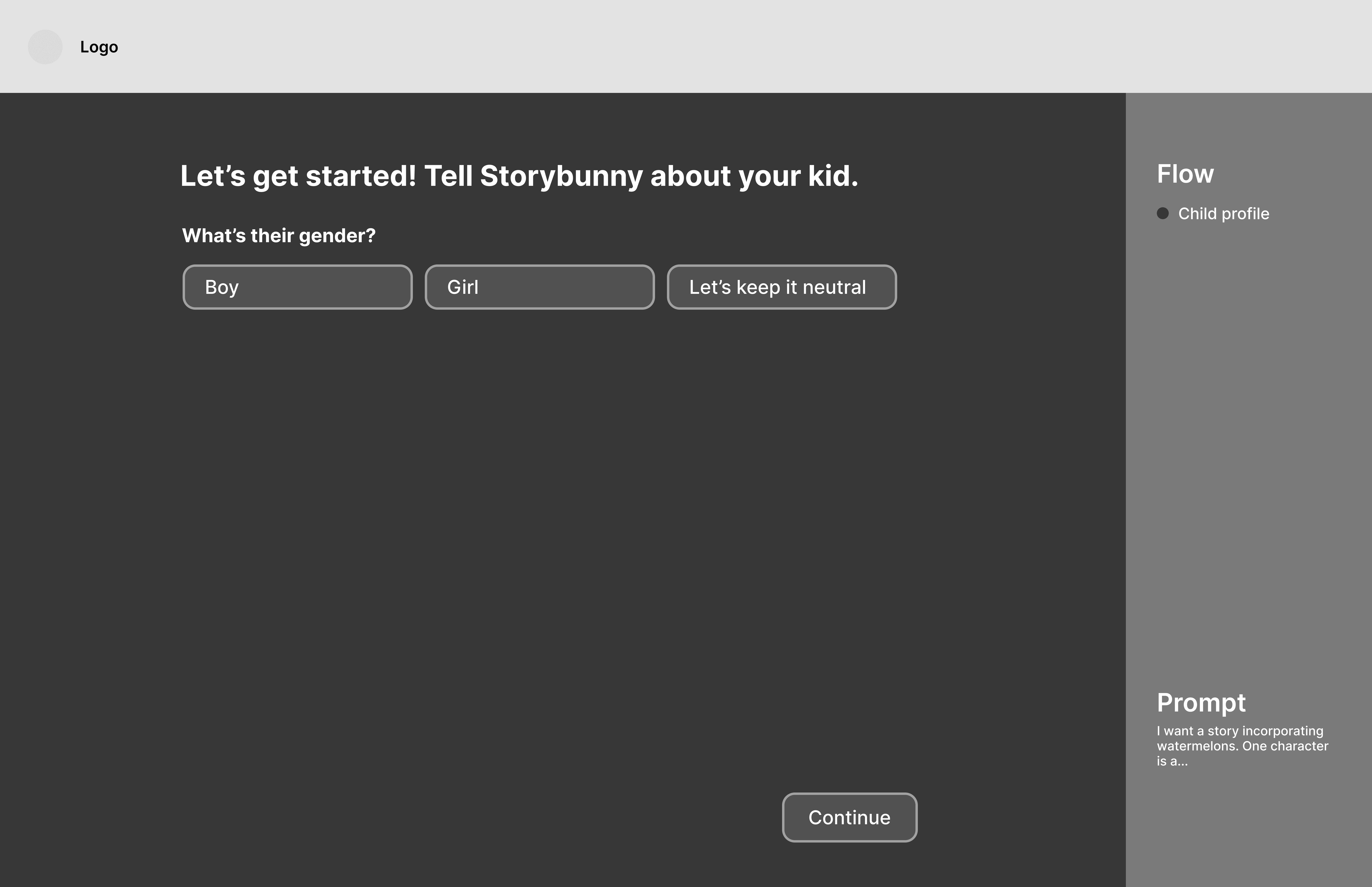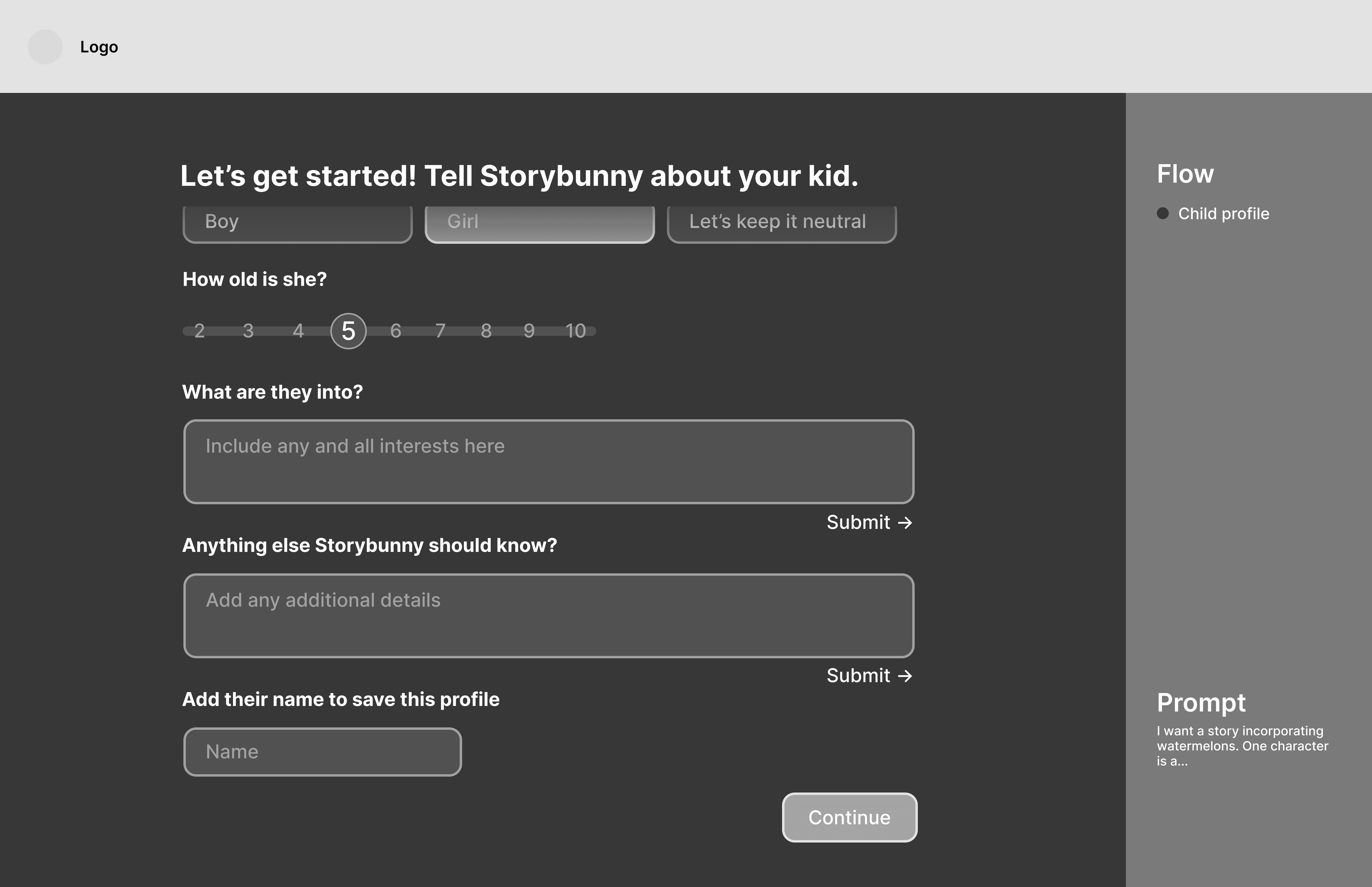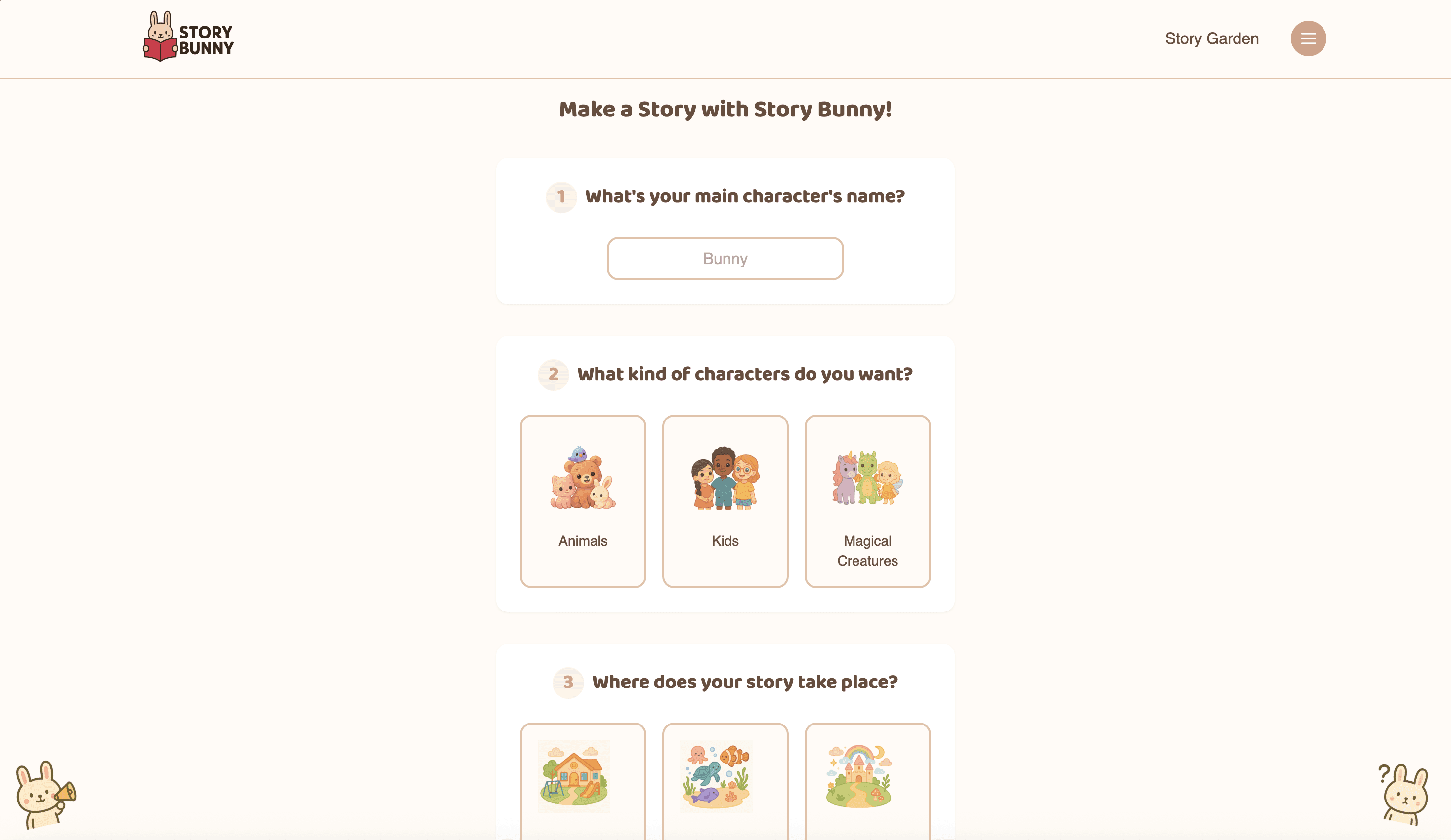 I wanted the story creation process to feel like an interactive, personalized experience instead of just a form, so I had the questions appear sequentially and included some generative elements.