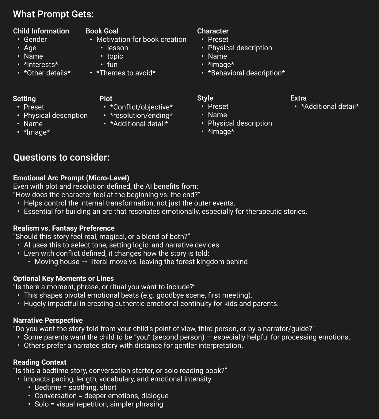 I started by brainstorming what information would be crucial to building the prompt, as well as considering other questions that would help shape the story in ways that would be effective for parents